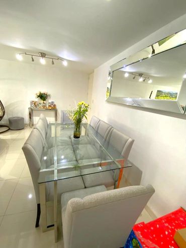 Sala comedor muy iluminada con balcón y vista a la calle.