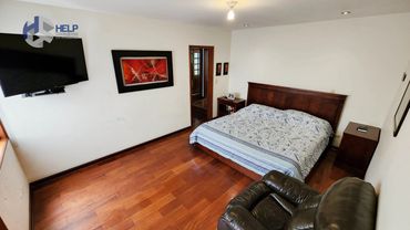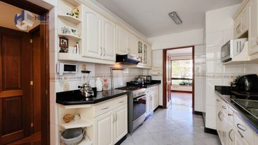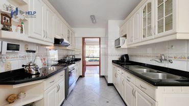 Amplia cocina con comedor de diario, lavadero con doble poza, cocina de vitrocerámica, reposteros altos y bajos, tableros de granito y campana extractora.
