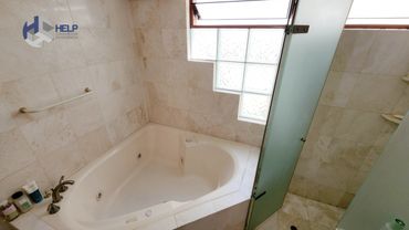 1 baño compartido con one piece, tablero de mármol, ducha independiente y jacuzzi con ducha