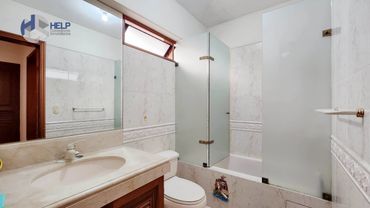 Dormitorio principal con baño incorporado con one piece, tablero de mármol, ducha independiente y jacuzzi con ducha.