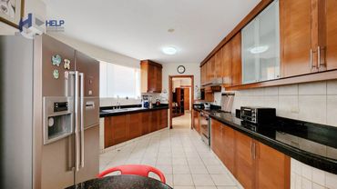 Amplia cocina con comedor de diario, lavadero con doble poza, cocina de vitrocerámica, con reposteros altos y bajos, con tableros de granito, campana extractora y almacén para víveres con repisas.